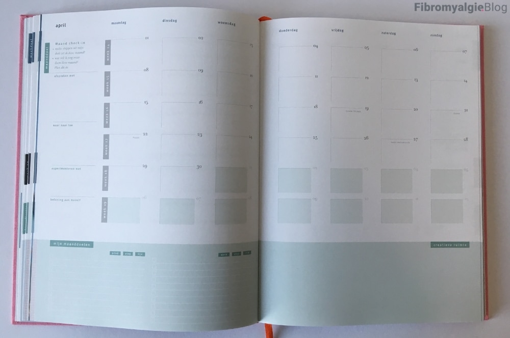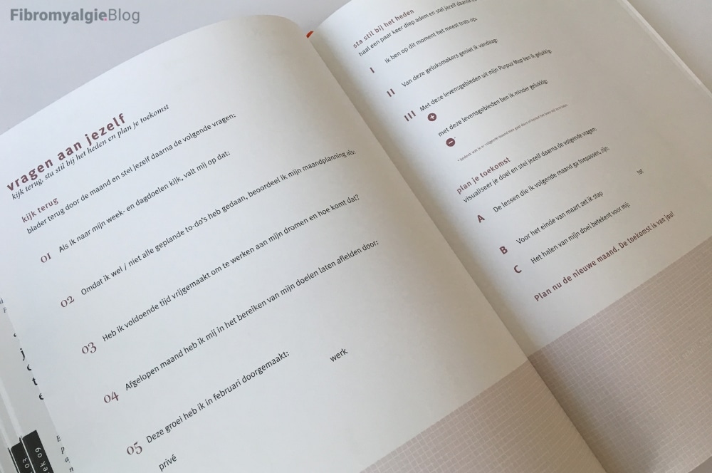 ^ Maandplanning – voor een globaal maandoverzicht met aan de linkerkant vragen als: afspreken met.. waar naartoe.. experimenteren met.. en beloning aan mezelf.. Onder aan de pagina is ruimte voor maanddoelen voor privé en werk en creatieve ruimte.