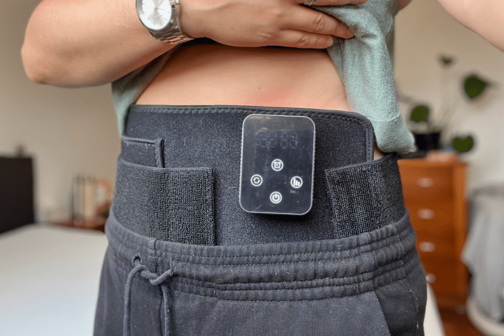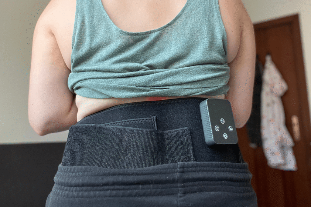 Het werkt heel makkelijk: je plaatst de brede elastiek aan één kant vast op de rugband en maakt de band vervolgens vast op de gewenste plek. In mijn geval mijn onderrug. Vervolgens klik je het kastje erop vast en stel je het in.